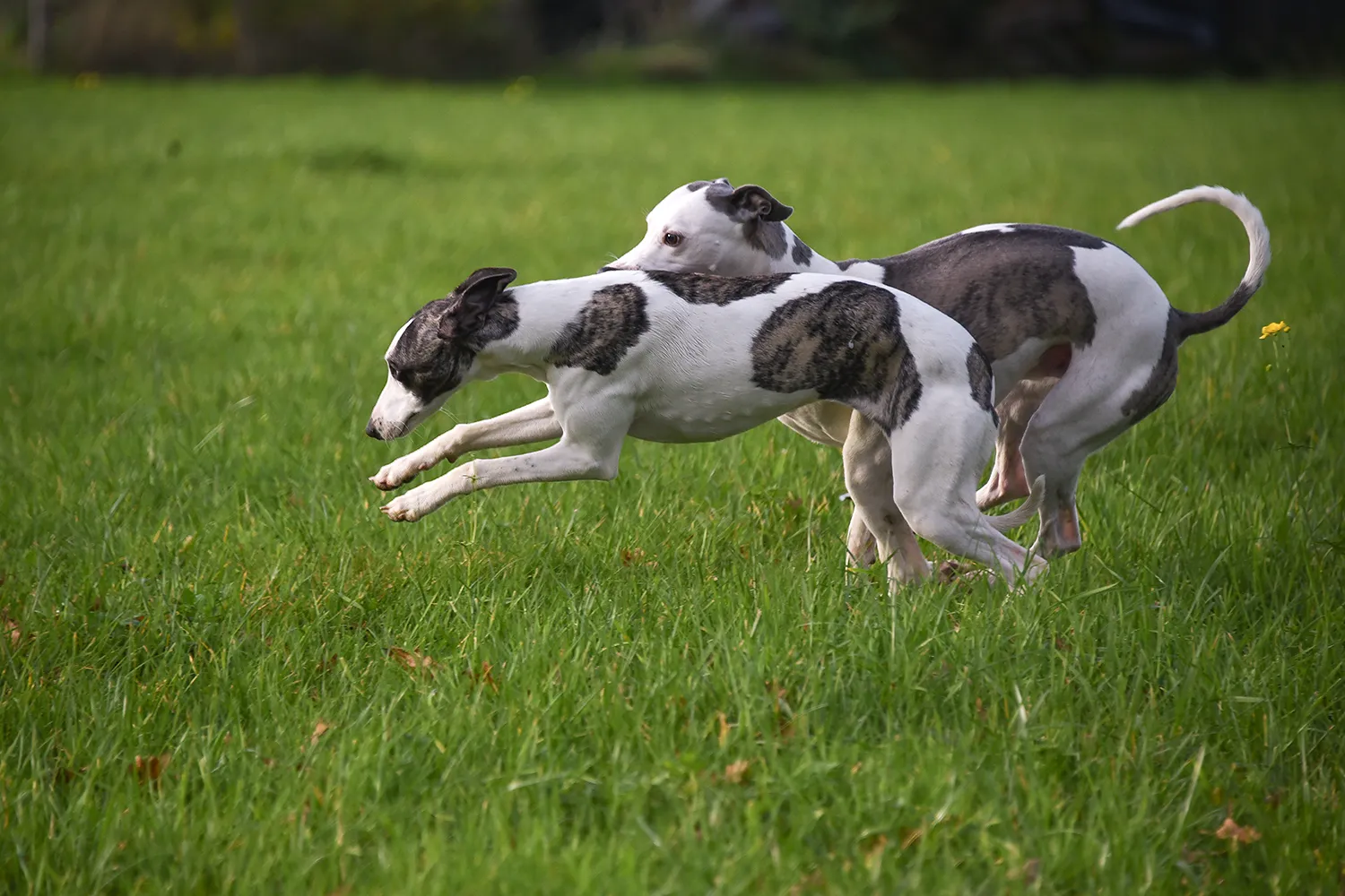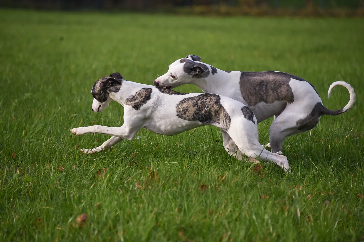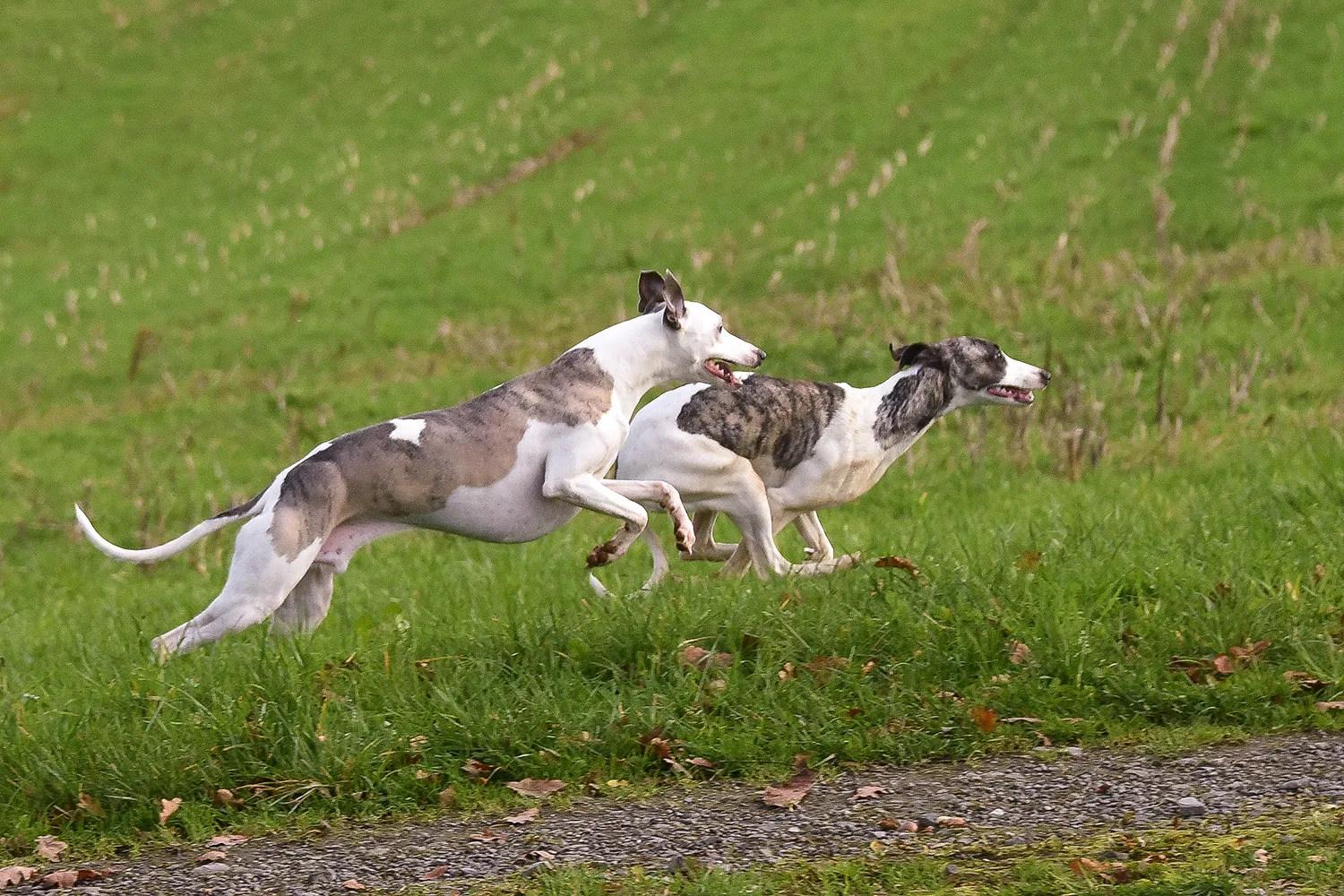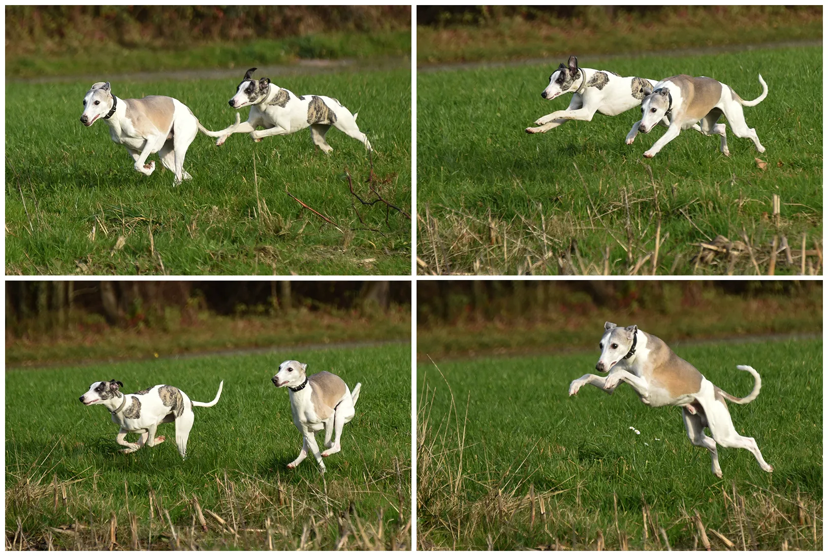 Immer wieder beeindruckend zu sehen, wie sauber und exakt die Whippets auch bei den wildesten Flitzereien kommunizieren können. Sobald Libellchen, die hier den Hasen macht, signalisiert, dass sie genug hat, ist sofort Ruhe und die Jungs haben sie nicht weiter verfolgt. Wenn das so funktioniert, kann man sie unbedenklich toben lassen.Zum Schluss noch einmal ein etwas anderes Paarfoto 😉Und – wo wir schon einmal dabei waren – ein bisschen Übung für die Ausstellung.