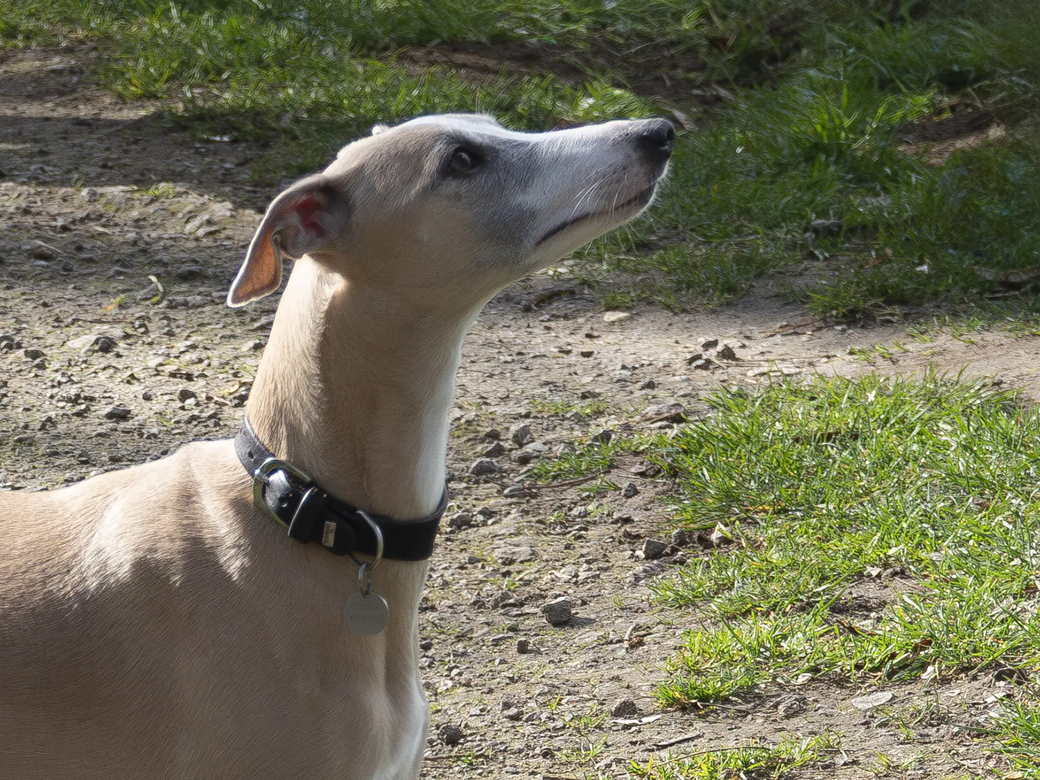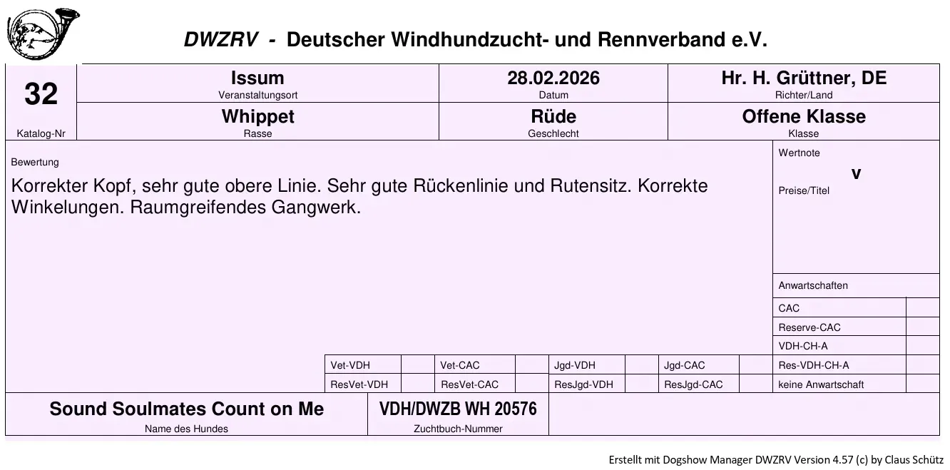Gestern hat Cocteau die Ausstellungssaison eröffnet und startete in der Offenen Klasse in Issum, wo Herr Grüttner/D die Whippets bewertete. Wie immer hat Cocteau sich sehr brav gezeigt – wenn auch nicht wirklich begeistert angesichts der doch recht ungemütlichen kalten Reithalle. Und so gab es diesmal nur ein unplatziertes V mit einem kurzen, aber treffenden Bericht.