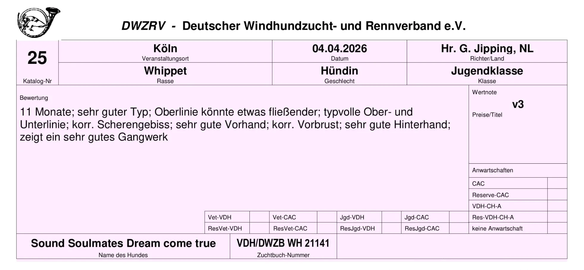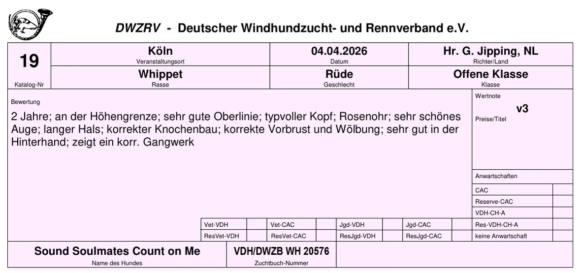 In der offenen Klasse der Rüden erhielt Cocteau das V3 mit einem sehr schönen Bericht.